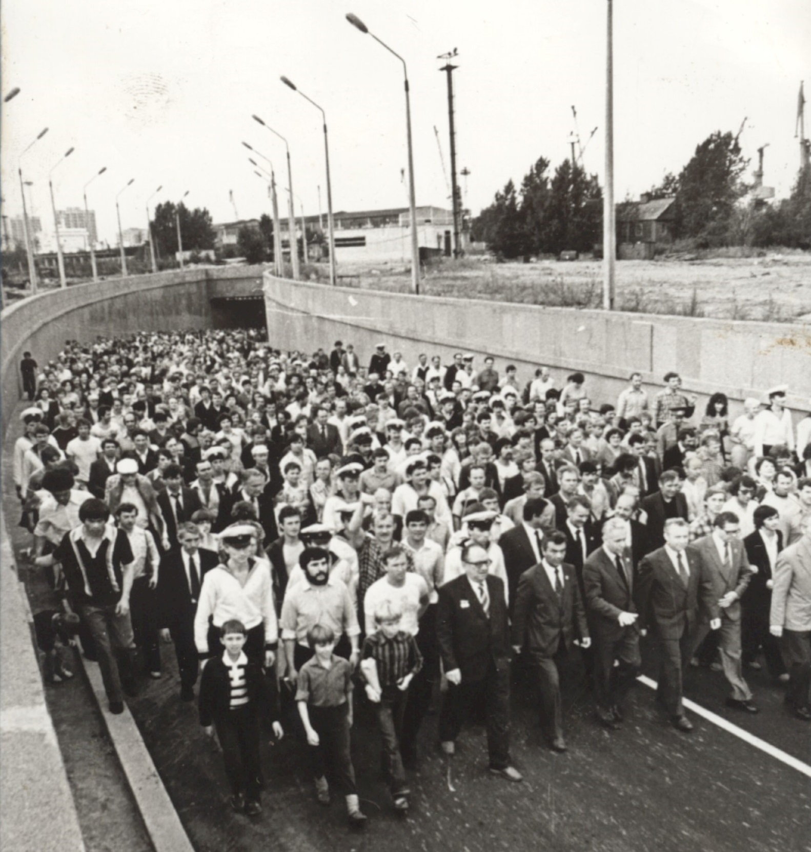 В том же юбилейном году был открыт автотранспортный тоннель под Морским каналом. Канонерский остров перестал быть островом в прямом смысле. Тоннельный переход связал его с городом, минуя порт. Теперь трудящиеся завода и жилпосёлка получили возможность приезжать на остров на городском транспорте.