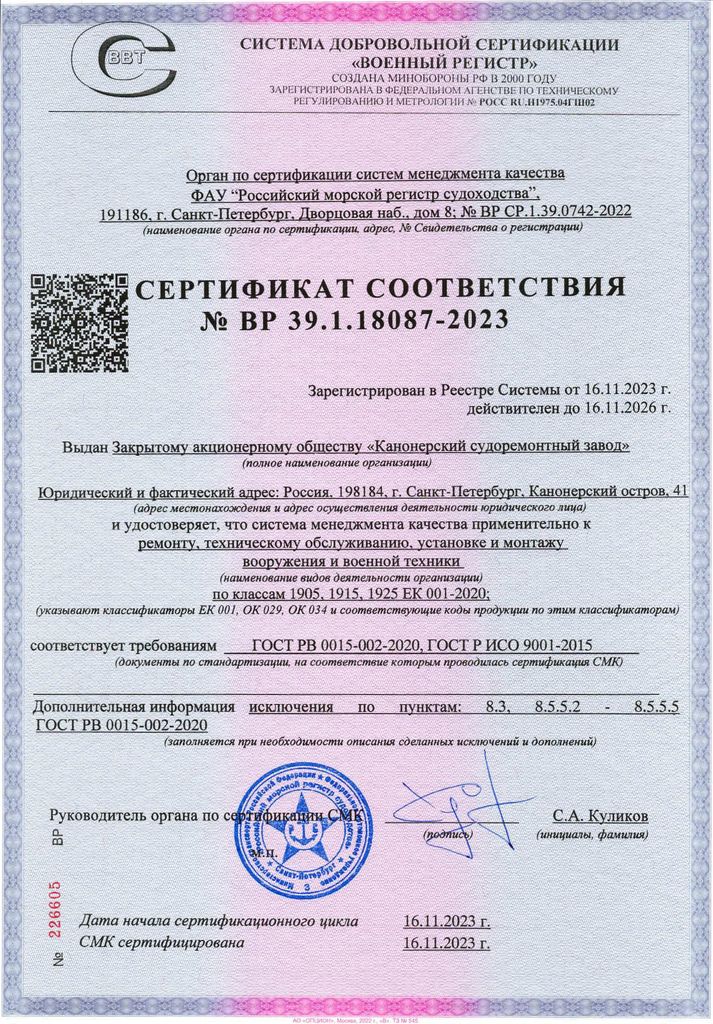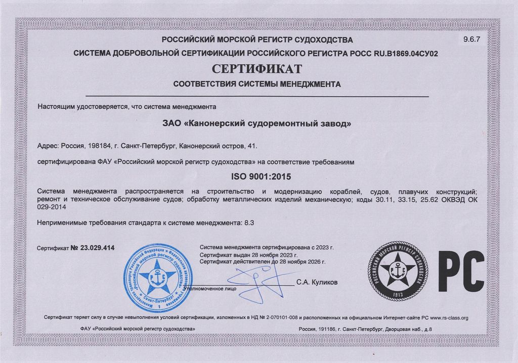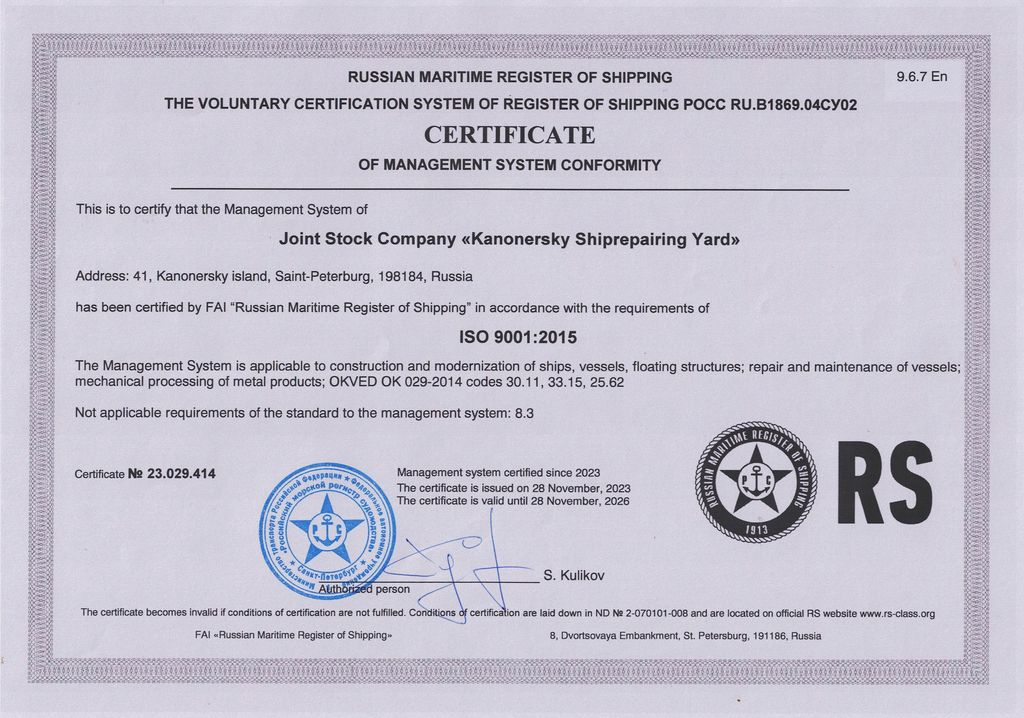 В 2000 году СМК была разработана, внедрена и сертифицирована. Подтверждение соответствия СМК требованиям вышеуказанных стандартов проводится сертификацией Российского морского регистра судоходства.